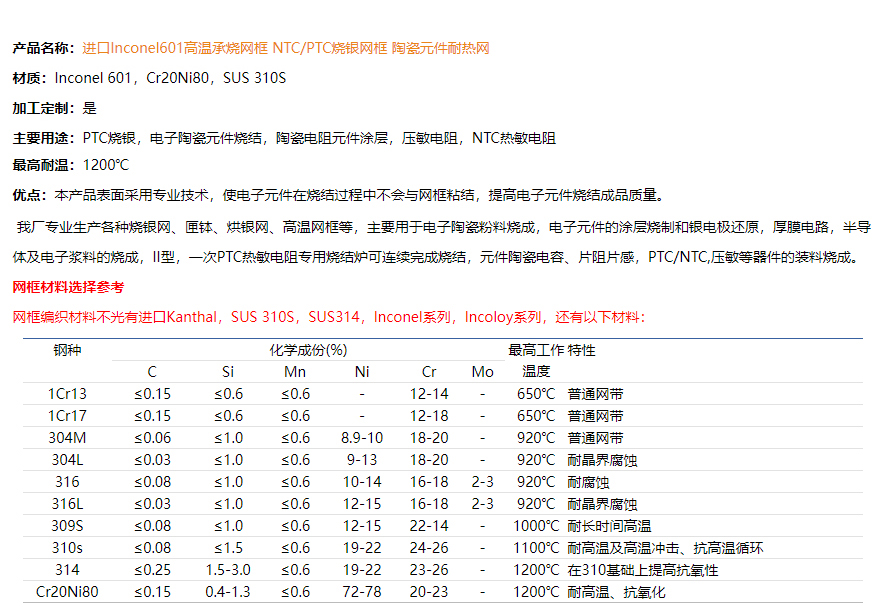 • Inconel601高温承烧网框